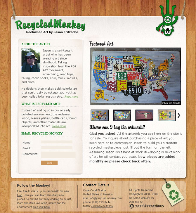Recycled Monkey is the web site portfolio of artist Jason Fritzsche. Jason uses 100% reclaimed materials for his one of a kind artwork. Jason has had his artwork featured in many shows and is quickly national appeal.